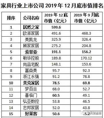 家具行业上市公司2019年12月底市值排名?