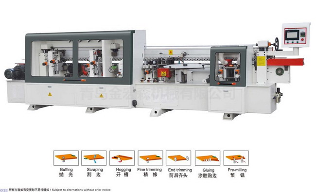 封边机粗精修系统功能和流程1、上端和下端的精修组件,马达功率0.75kw,马达电压220/380v,转速18000r/min,刀径65mm,倒角R2mm,刀齿数4。封边机粗精修系统由一次修边和二次修边两部分组成,一次修刀为平刀刃,二次修刀为圆弧刀,每个铣刀单位由下列部分组成,通过大仿形轮和小仿形轮导引,工件将由铣刀加工成型,压膜将被铣切,刀具将逆向加工。它除...