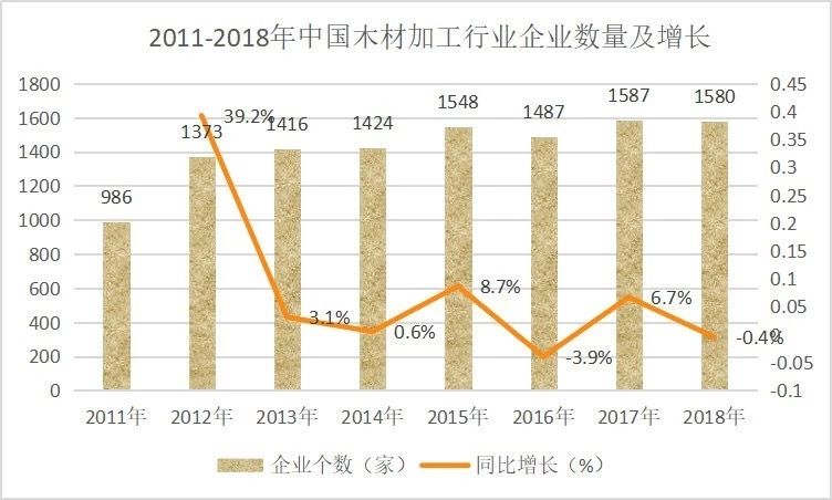 改革开放以来,经过40年的发展,我国木材加工行业已经取得长足发展,2018年销售规模已达1999.35亿元,规模以上企业数量达1580家。在此背景下,锯材、木片、人造板、木制品等细分市场也有显著发展。